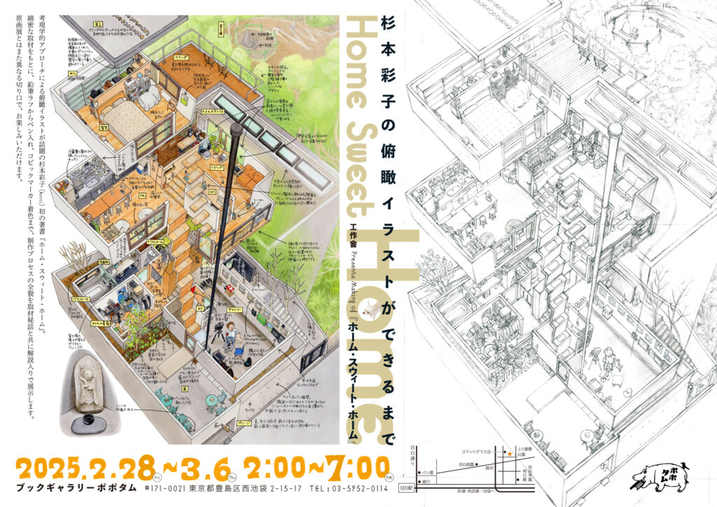 考現学的アプローチによる俯瞰イラストが話題の杉本彩子(Kucci)初の著書『ホーム・スウィート・ホーム』(工作舎 2024年12月)。原画展とは異なる切り口で、綿密な取材をもとにした鉛筆ラフからペン入れ、コピックマーカー着色まで、制作プロセスの全貌を取材秘話と共に解説入りで展示します。